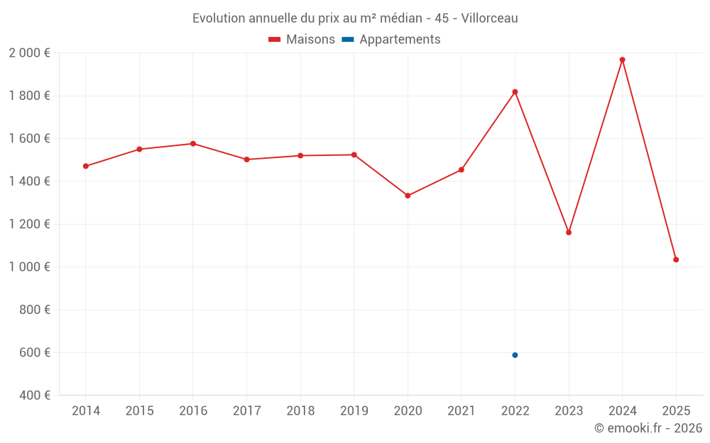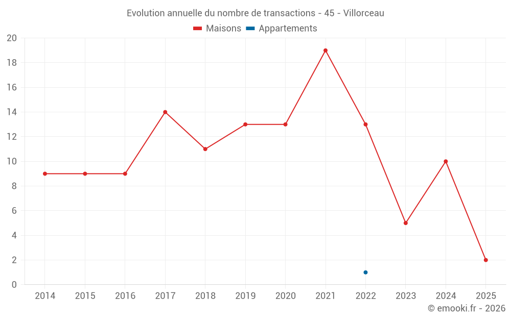 Le prix médian sur les 16 transactions de maisons des 24 derniers mois dans la commune de Villorceau était de 1 648 € par mètre carré pour une valeur foncière médiane de 182 000 €. Sur cette période 60% des transactions se sont situées entre 1 161 et 2 219 € par mètre carré (du 2ème au 8ème déciles).