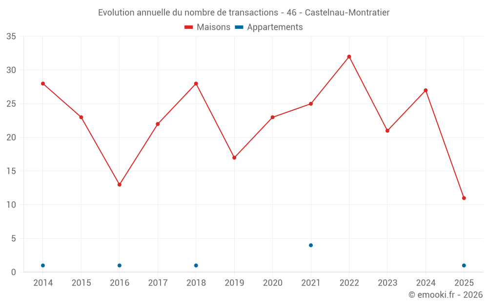 Le prix médian sur les 27 transactions de maisons des 12 derniers mois dans la commune de Castelnau-Montratier était de 1 556 € par mètre carré pour une valeur foncière médiane de 166 260 €. Sur cette période 60% des transactions se sont situées entre 1 196 et 2 310 € par mètre carré (du 2ème au 8ème déciles).