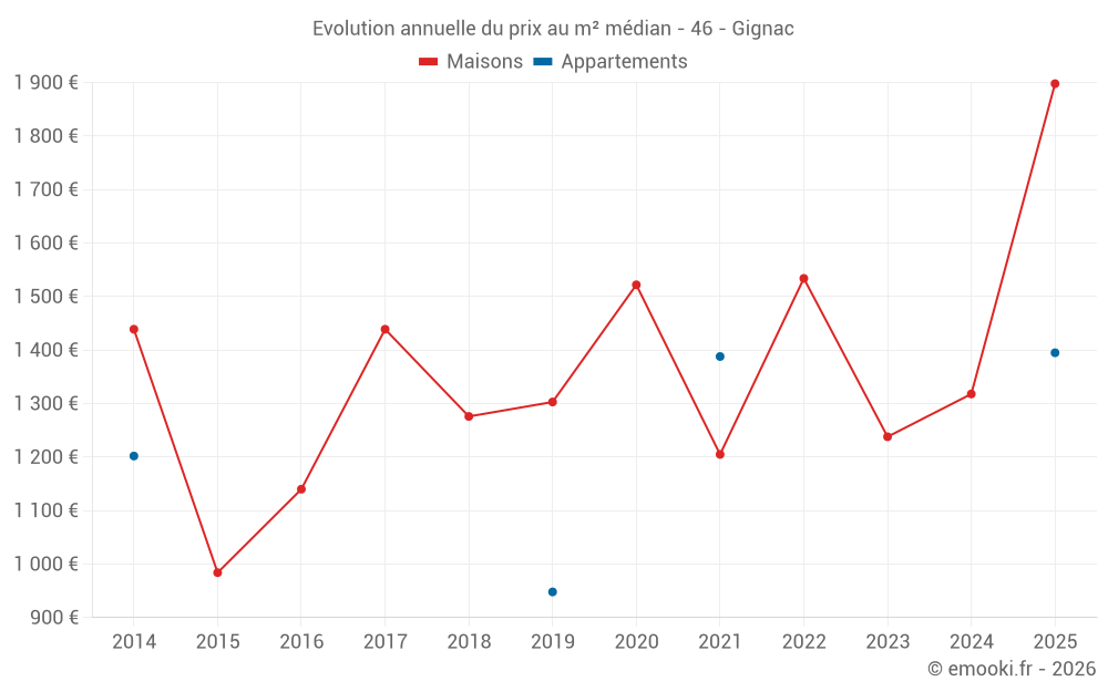 Le prix médian sur les 16 transactions de maisons des 24 derniers mois dans la commune de Gignac était de 1 690 € par mètre carré pour une valeur foncière médiane de 250 800 €. Sur cette période 60% des transactions se sont situées entre 1 222 et 2 138 € par mètre carré (du 2ème au 8ème déciles).