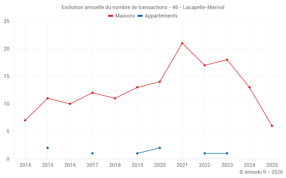 Le prix médian sur les 27 transactions de maisons des 24 derniers mois dans la commune de Lacapelle-Marival était de 1 235 € par mètre carré pour une valeur foncière médiane de 105 000 €. Sur cette période 60% des transactions se sont situées entre 508 et 1 670 € par mètre carré (du 2ème au 8ème déciles).
