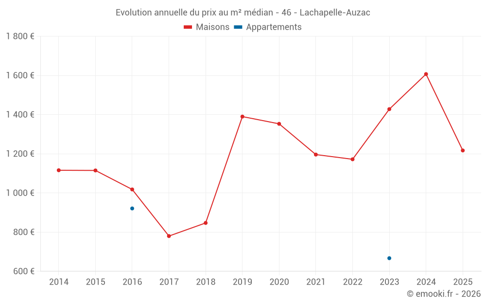 Le prix médian sur les 35 transactions de maisons des 24 derniers mois dans la commune de Lachapelle-Auzac était de 1 382 € par mètre carré pour une valeur foncière médiane de 113 000 €. Sur cette période 60% des transactions se sont situées entre 856 et 1 662 € par mètre carré (du 2ème au 8ème déciles).