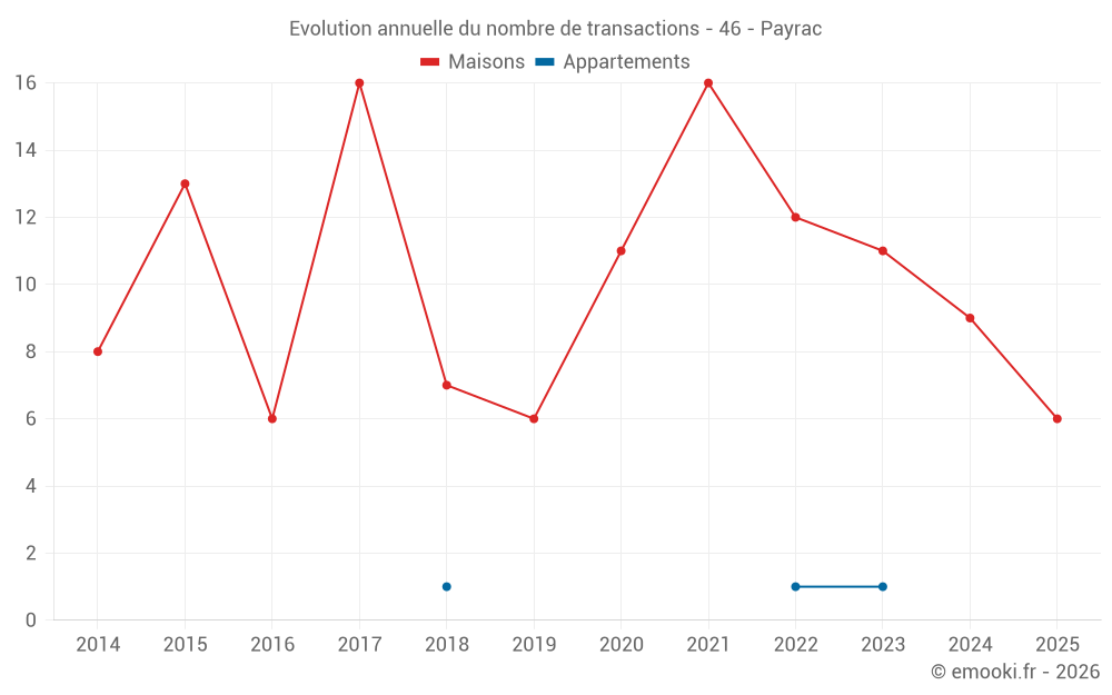 Le prix médian sur les 24 transactions de maisons des 24 derniers mois dans la commune de Payrac était de 1 130 € par mètre carré pour une valeur foncière médiane de 118 300 €. Sur cette période 60% des transactions se sont situées entre 645 et 1 786 € par mètre carré (du 2ème au 8ème déciles).