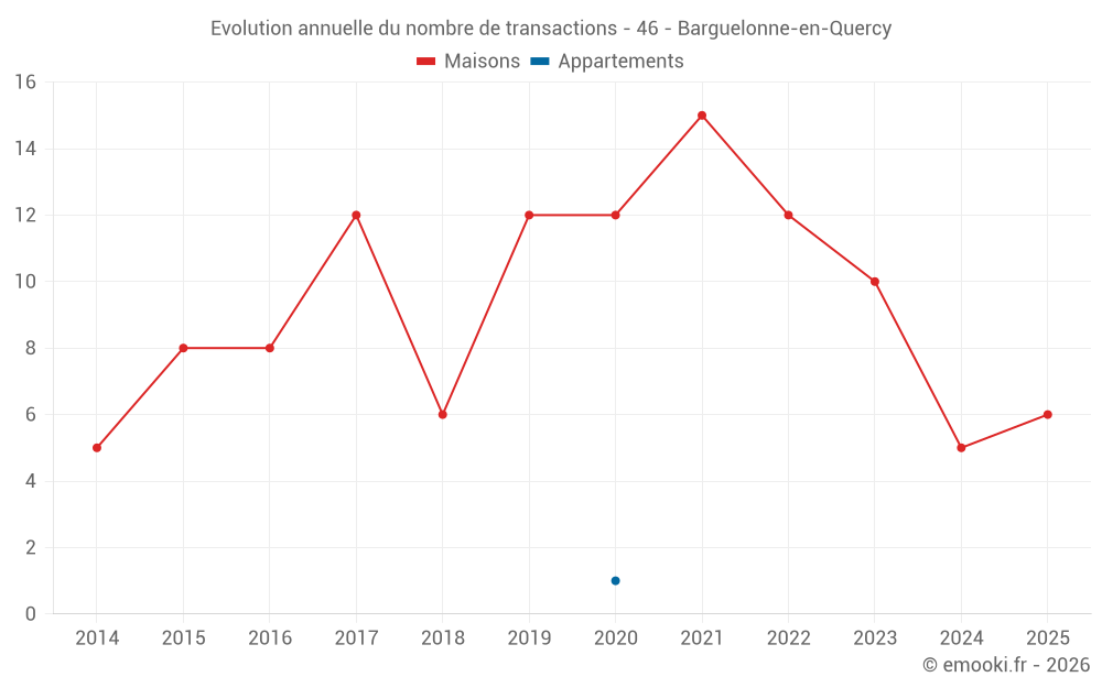 Le prix médian sur les 16 transactions de maisons des 24 derniers mois dans la commune de Barguelonne-en-Quercy était de 1 400 € par mètre carré pour une valeur foncière médiane de 143 250 €. Sur cette période 60% des transactions se sont situées entre 1 169 et 2 740 € par mètre carré (du 2ème au 8ème déciles).