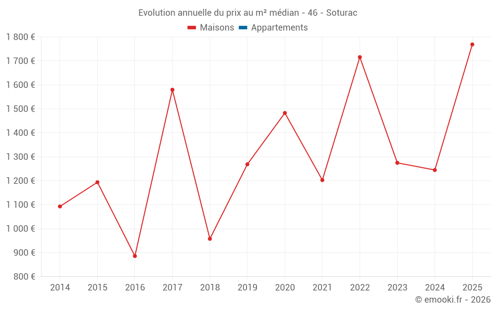 Le prix médian sur les 15 transactions de maisons des 24 derniers mois dans la commune de Soturac était de 1 245 € par mètre carré pour une valeur foncière médiane de 203 580 €. Sur cette période 60% des transactions se sont situées entre 593 et 2 621 € par mètre carré (du 2ème au 8ème déciles).