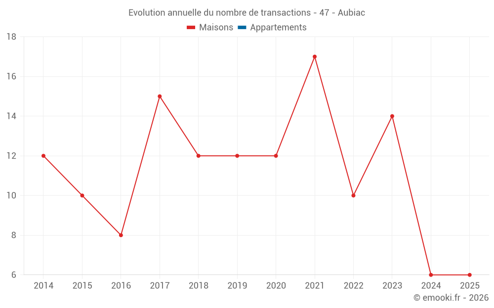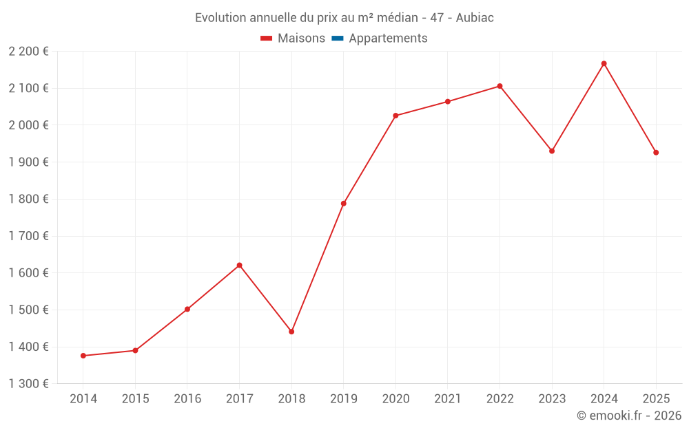 Le prix médian sur les 20 transactions de maisons des 24 derniers mois dans la commune d'Aubiac était de 2 020 € par mètre carré pour une valeur foncière médiane de 217 750 €. Sur cette période 60% des transactions se sont situées entre 1 454 et 2 669 € par mètre carré (du 2ème au 8ème déciles).
