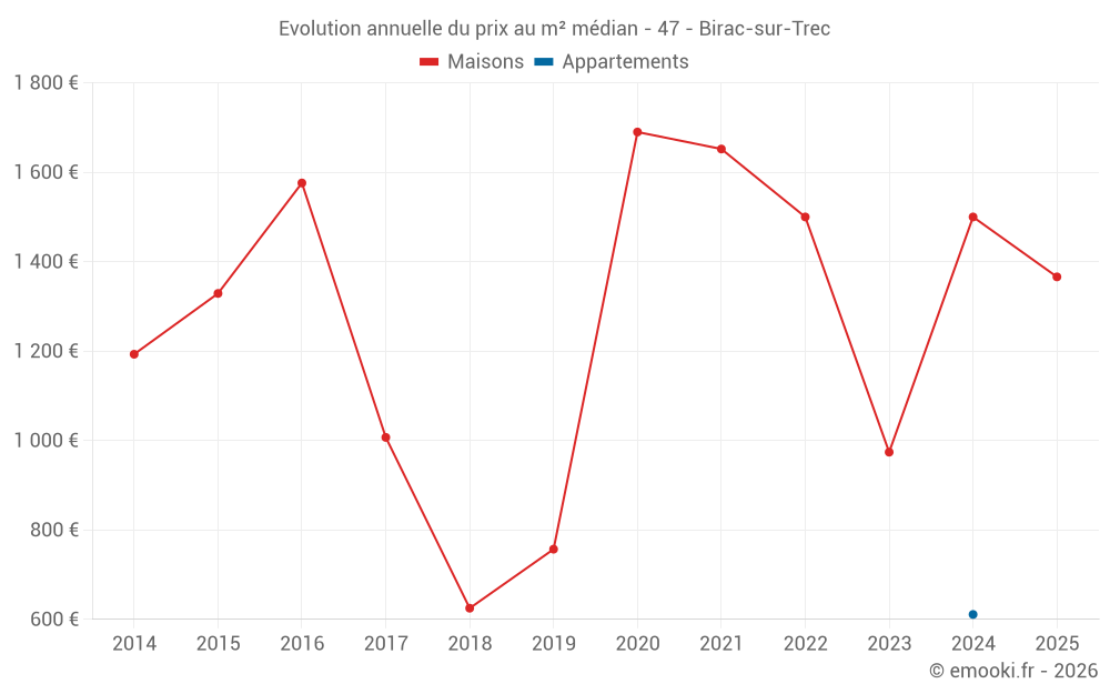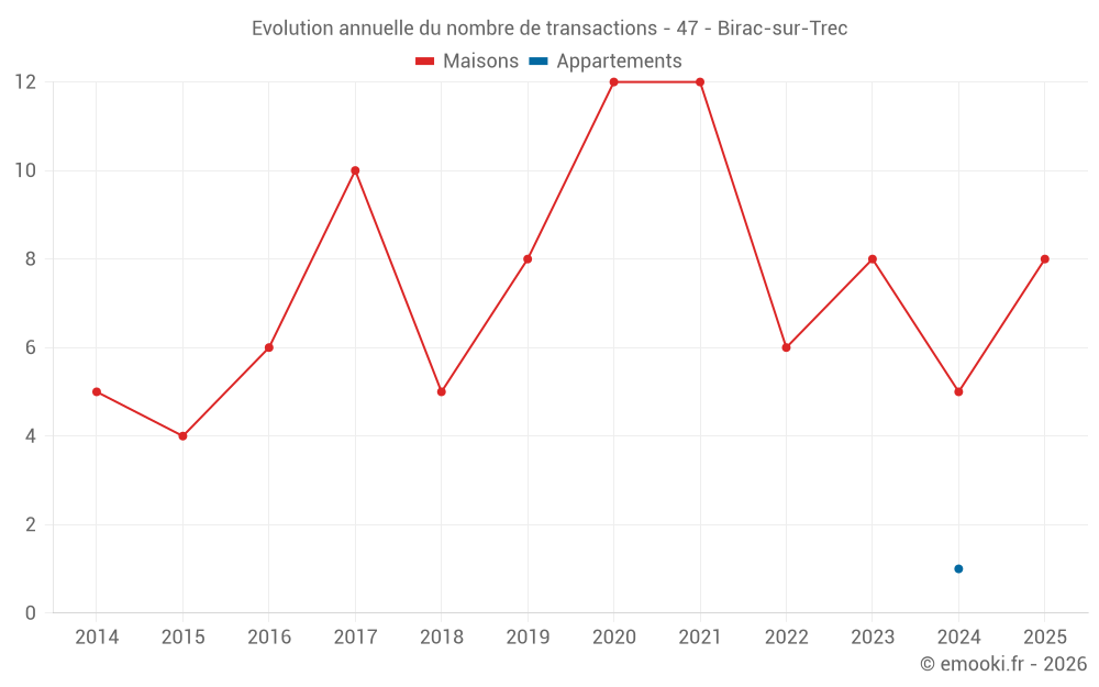 Le prix médian sur les 16 transactions de maisons des 24 derniers mois dans la commune de Birac-sur-Trec était de 1 240 € par mètre carré pour une valeur foncière médiane de 151 925 €. Sur cette période 60% des transactions se sont situées entre 747 et 1 864 € par mètre carré (du 2ème au 8ème déciles).