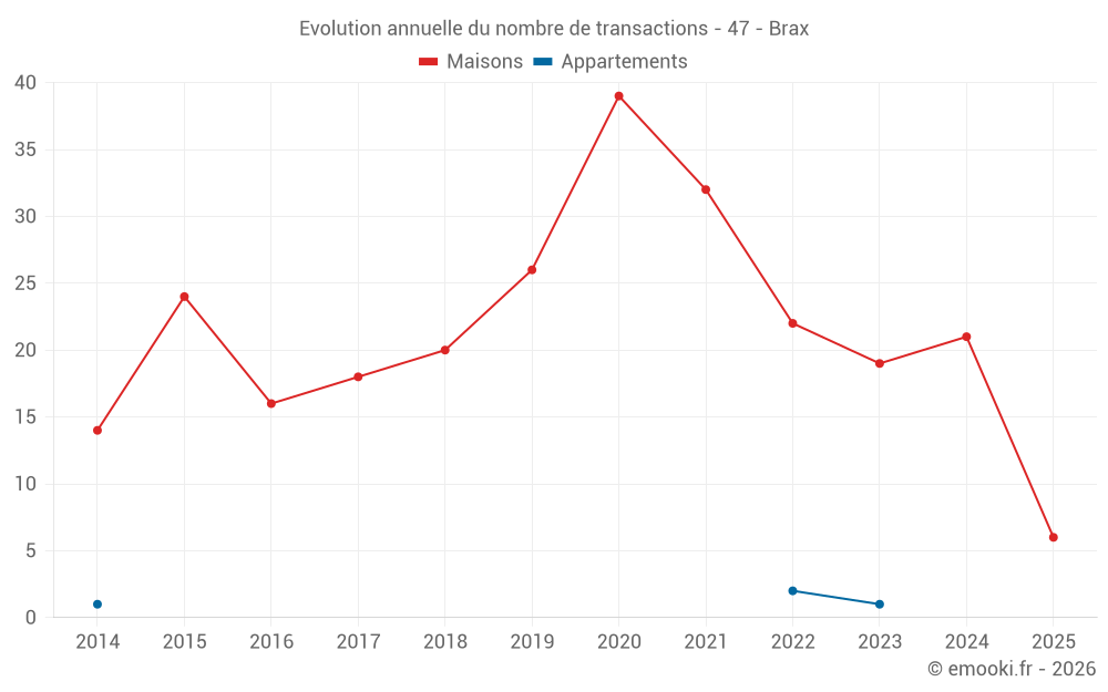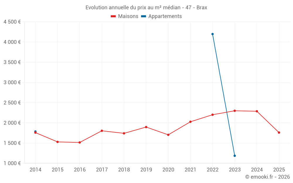 Le prix médian sur les 17 transactions de maisons des 12 derniers mois dans la commune de Brax était de 2 156 € par mètre carré pour une valeur foncière médiane de 227 000 €. Sur cette période 60% des transactions se sont situées entre 1 652 et 2 292 € par mètre carré (du 2ème au 8ème déciles).