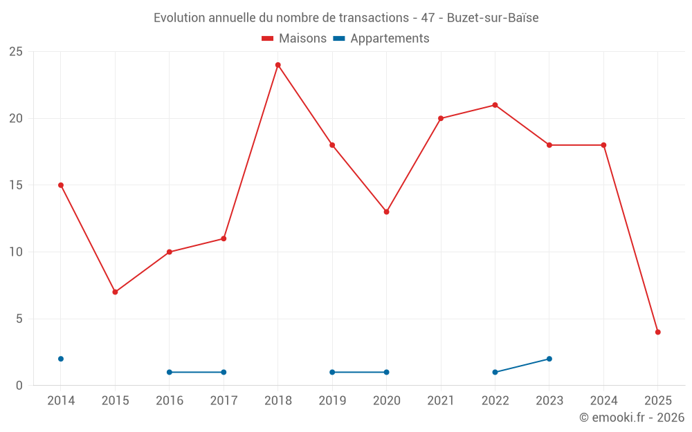 Le prix médian sur les 31 transactions de maisons des 24 derniers mois dans la commune de Buzet-sur-Baïse était de 1 220 € par mètre carré pour une valeur foncière médiane de 105 000 €. Sur cette période 60% des transactions se sont situées entre 585 et 1 591 € par mètre carré (du 2ème au 8ème déciles).