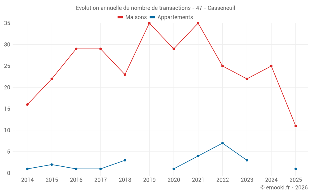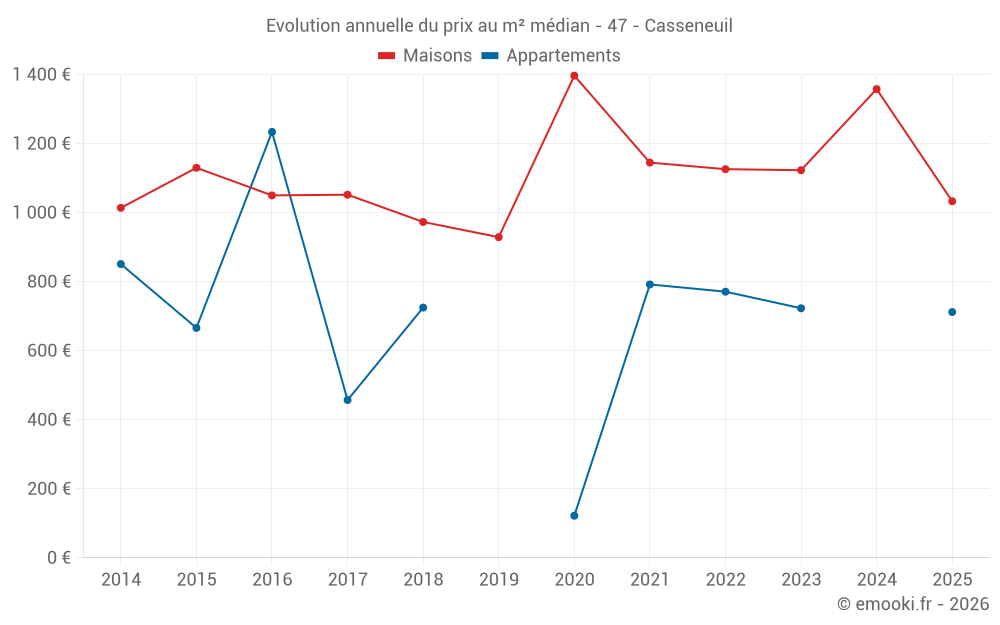 Le prix médian sur les 30 transactions de maisons des 12 derniers mois dans la commune de Casseneuil était de 1 136 € par mètre carré pour une valeur foncière médiane de 119 650 €. Sur cette période 60% des transactions se sont situées entre 705 et 1 714 € par mètre carré (du 2ème au 8ème déciles).