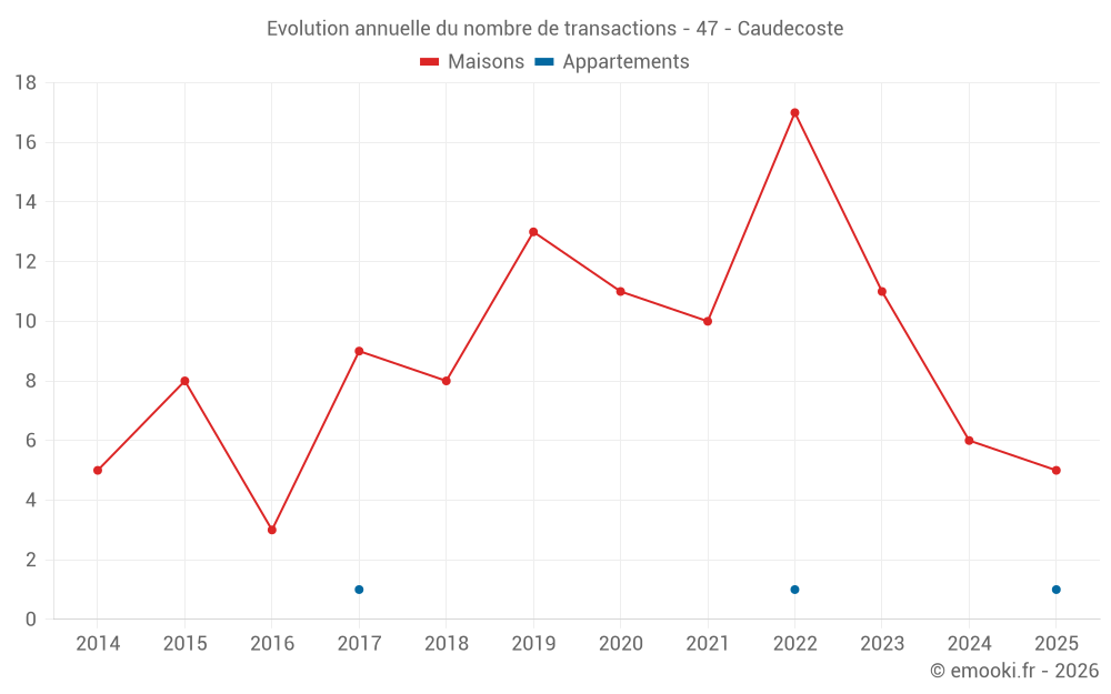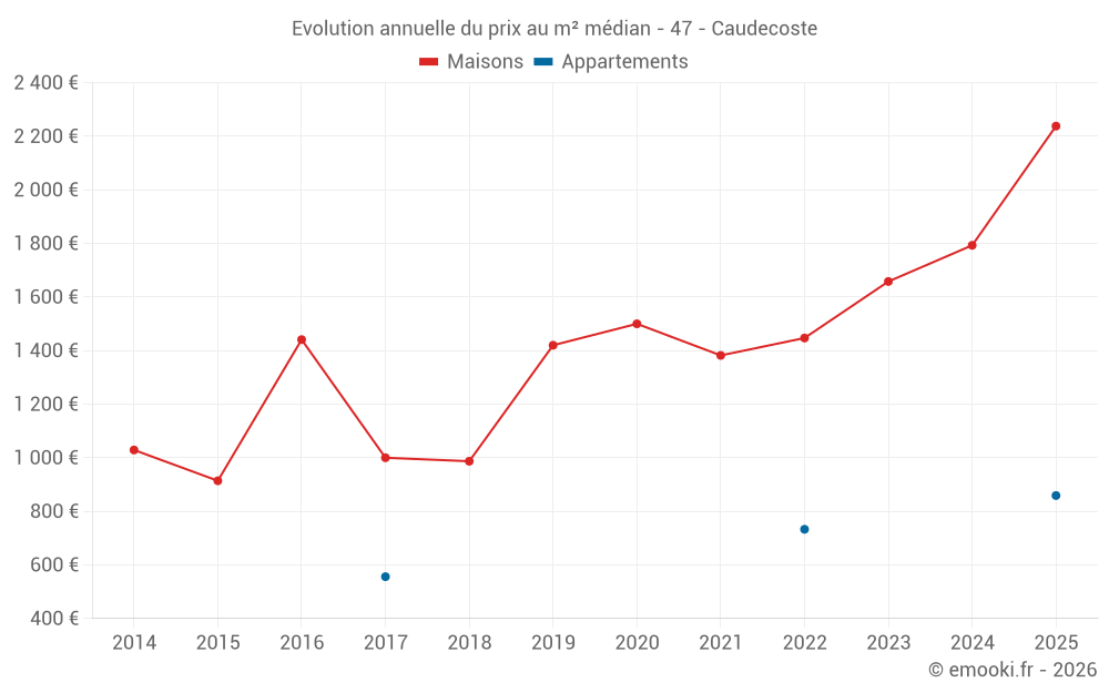 Le prix médian sur les 17 transactions de maisons des 24 derniers mois dans la commune de Caudecoste était de 1 953 € par mètre carré pour une valeur foncière médiane de 180 000 €. Sur cette période 60% des transactions se sont situées entre 1 305 et 2 255 € par mètre carré (du 2ème au 8ème déciles).