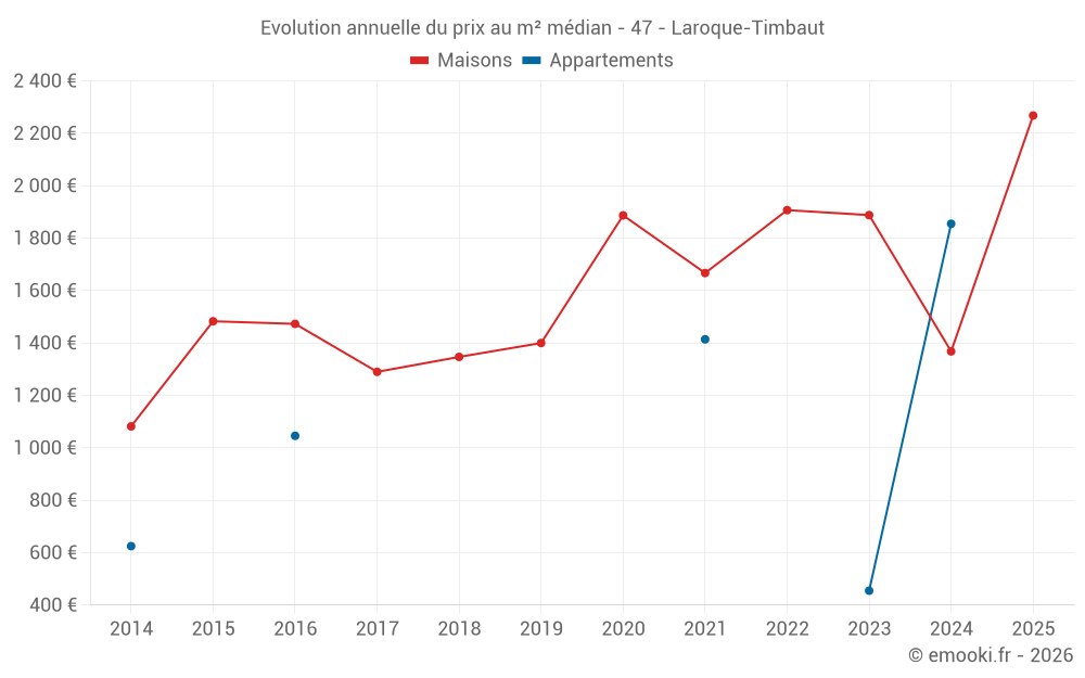 Le prix médian sur les 32 transactions de maisons des 24 derniers mois dans la commune de Laroque-Timbaut était de 1 547 € par mètre carré pour une valeur foncière médiane de 170 000 €. Sur cette période 60% des transactions se sont situées entre 972 et 2 455 € par mètre carré (du 2ème au 8ème déciles).
