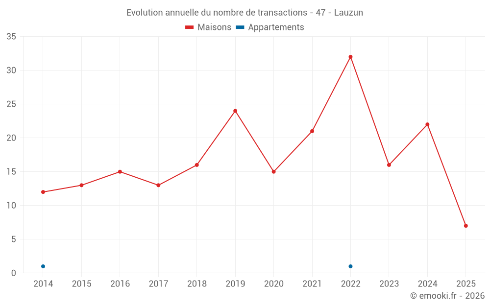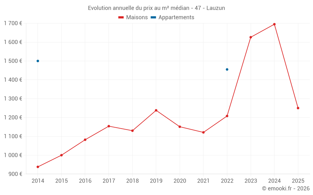Le prix médian sur les 24 transactions de maisons des 12 derniers mois dans la commune de Lauzun était de 1 788 € par mètre carré pour une valeur foncière médiane de 225 000 €. Sur cette période 60% des transactions se sont situées entre 1 296 et 2 435 € par mètre carré (du 2ème au 8ème déciles).