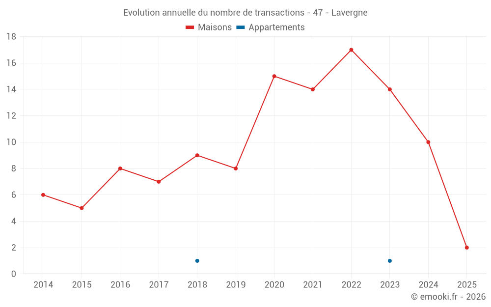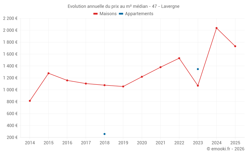 Le prix médian sur les 15 transactions de maisons des 24 derniers mois dans la commune de Lavergne était de 1 944 € par mètre carré pour une valeur foncière médiane de 180 860 €. Sur cette période 60% des transactions se sont situées entre 1 013 et 2 587 € par mètre carré (du 2ème au 8ème déciles).