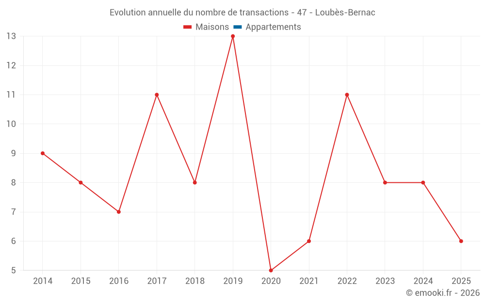 Le prix médian sur les 18 transactions de maisons des 24 derniers mois dans la commune de Loubès-Bernac était de 1 572 € par mètre carré pour une valeur foncière médiane de 159 100 €. Sur cette période 60% des transactions se sont situées entre 1 158 et 1 757 € par mètre carré (du 2ème au 8ème déciles).