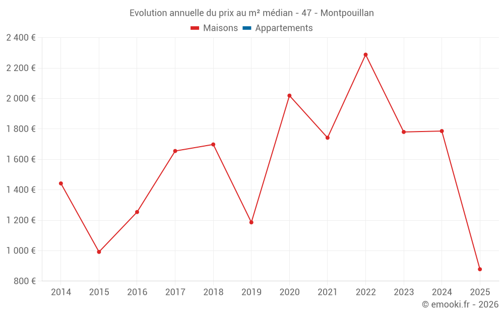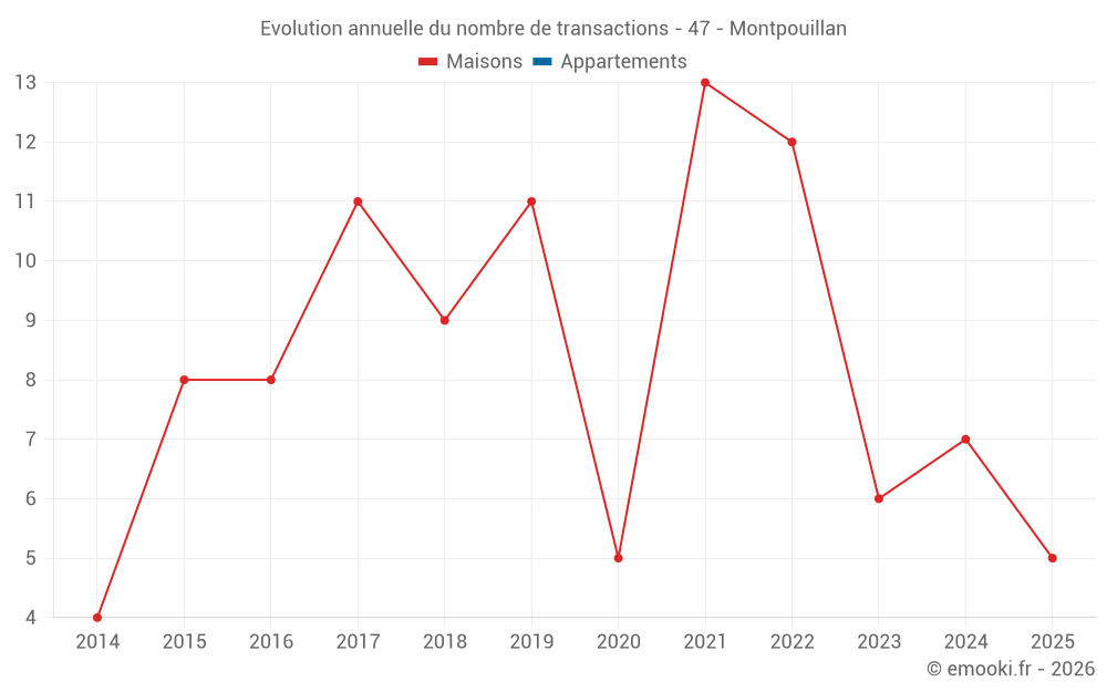 Le prix médian sur les 17 transactions de maisons des 24 derniers mois dans la commune de Montpouillan était de 1 600 € par mètre carré pour une valeur foncière médiane de 148 000 €. Sur cette période 60% des transactions se sont situées entre 901 et 2 240 € par mètre carré (du 2ème au 8ème déciles).