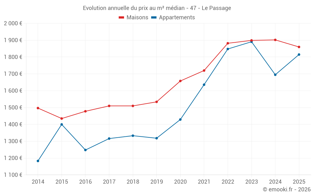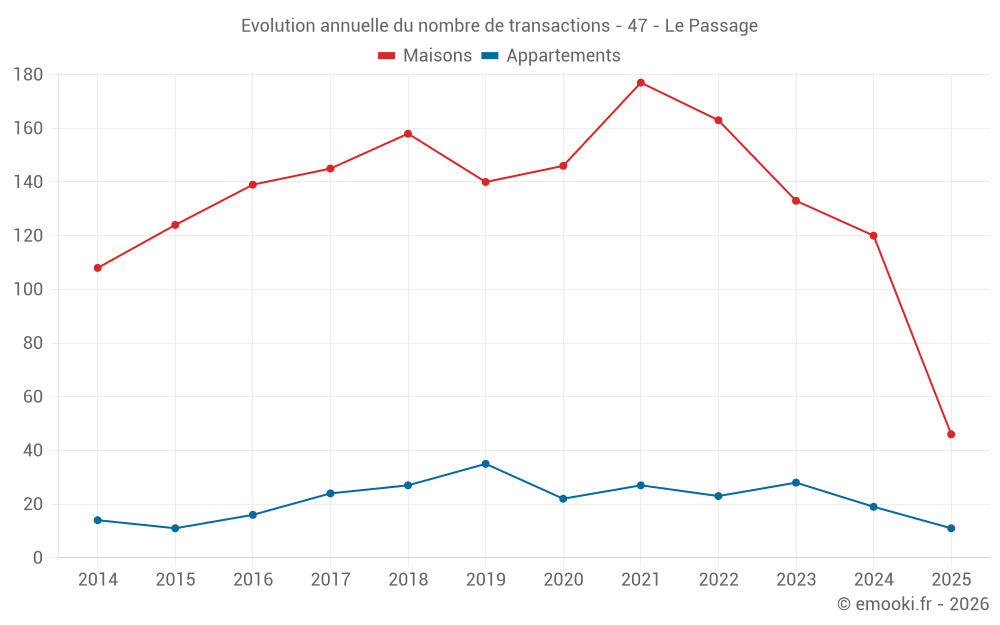 Le prix médian sur les 25 transactions de maisons des 3 derniers mois dans la commune du Passage était de 1 870 € par mètre carré pour une valeur foncière médiane de 157 000 €. Sur cette période 60% des transactions se sont situées entre 1 501 et 2 116 € par mètre carré (du 2ème au 8ème déciles).
