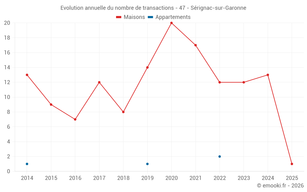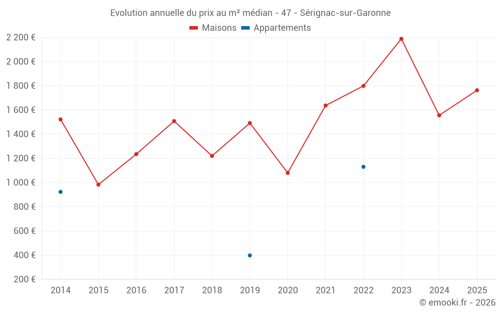 Le prix médian sur les 20 transactions de maisons des 24 derniers mois dans la commune de Sérignac-sur-Garonne était de 1 839 € par mètre carré pour une valeur foncière médiane de 197 440 €. Sur cette période 60% des transactions se sont situées entre 1 322 et 2 418 € par mètre carré (du 2ème au 8ème déciles).