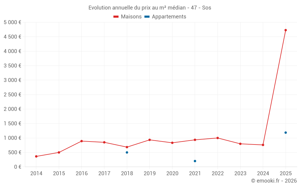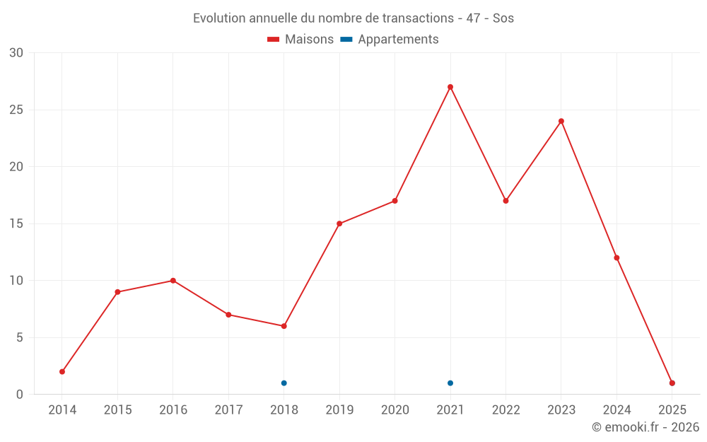 Le prix médian sur les 20 transactions de maisons des 24 derniers mois dans la commune de Sos était de 764 € par mètre carré pour une valeur foncière médiane de 69 000 €. Sur cette période 60% des transactions se sont situées entre 215 et 1 384 € par mètre carré (du 2ème au 8ème déciles).