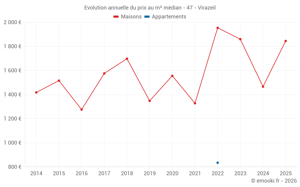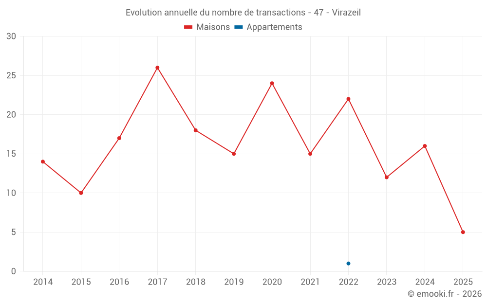 Le prix médian sur les 16 transactions de maisons des 12 derniers mois dans la commune de Virazeil était de 1 476 € par mètre carré pour une valeur foncière médiane de 145 250 €. Sur cette période 60% des transactions se sont situées entre 1 000 et 2 047 € par mètre carré (du 2ème au 8ème déciles).