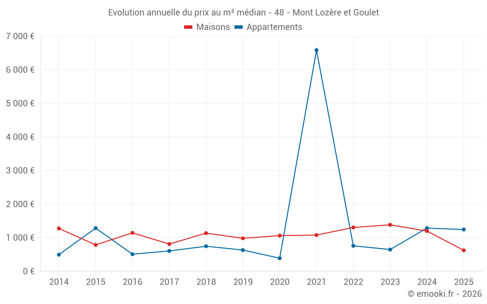Le prix médian sur les 24 transactions de maisons des 24 derniers mois dans la commune de Mont Lozère et Goulet était de 1 163 € par mètre carré pour une valeur foncière médiane de 110 000 €. Sur cette période 60% des transactions se sont situées entre 618 et 2 042 € par mètre carré (du 2ème au 8ème déciles).