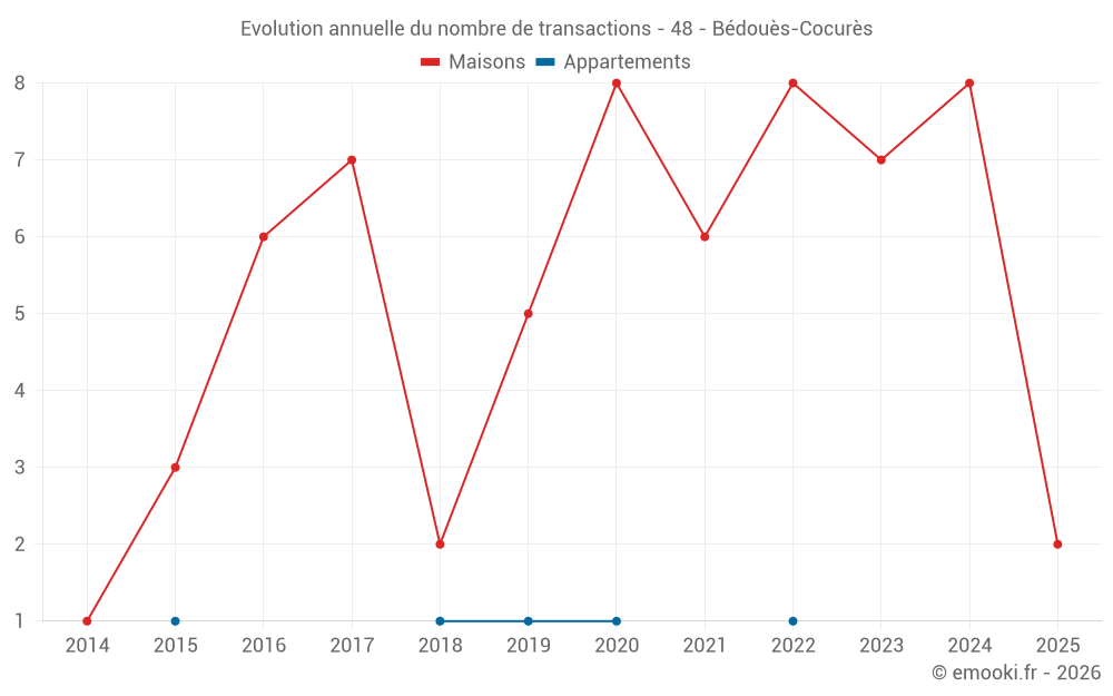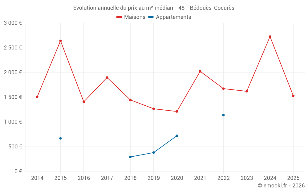 Le prix médian sur les 14 transactions de maisons des 24 derniers mois dans la commune de Bédouès-Cocurès était de 1 850 € par mètre carré pour une valeur foncière médiane de 203 680 €. Sur cette période 60% des transactions se sont situées entre 1 303 et 2 963 € par mètre carré (du 2ème au 8ème déciles).