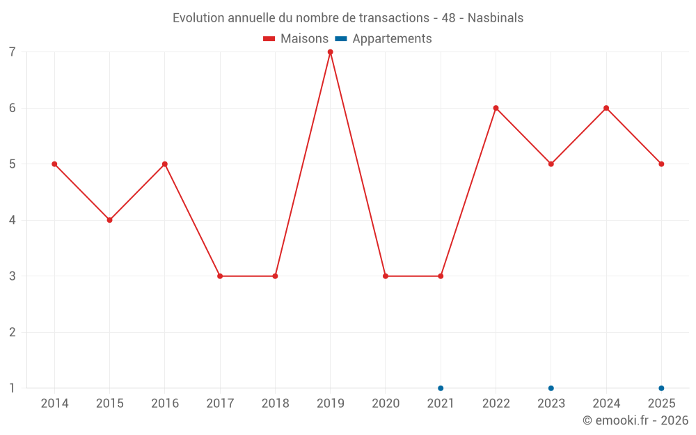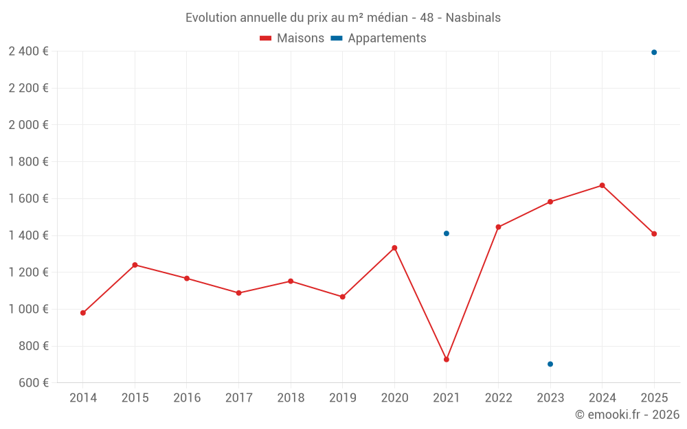 Le prix médian sur les 14 transactions de maisons des 24 derniers mois dans la commune de Nasbinals était de 1 330 € par mètre carré pour une valeur foncière médiane de 87 500 €. Sur cette période 60% des transactions se sont situées entre 626 et 2 317 € par mètre carré (du 2ème au 8ème déciles).