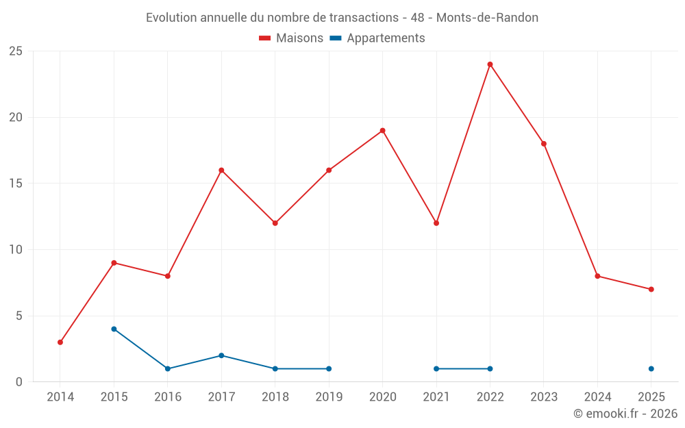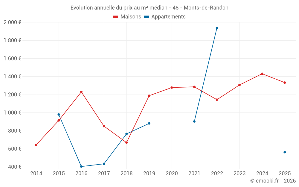 Le prix médian sur les 22 transactions de maisons des 24 derniers mois dans la commune de Monts-de-Randon était de 1 354 € par mètre carré pour une valeur foncière médiane de 126 000 €. Sur cette période 60% des transactions se sont situées entre 967 et 2 284 € par mètre carré (du 2ème au 8ème déciles).