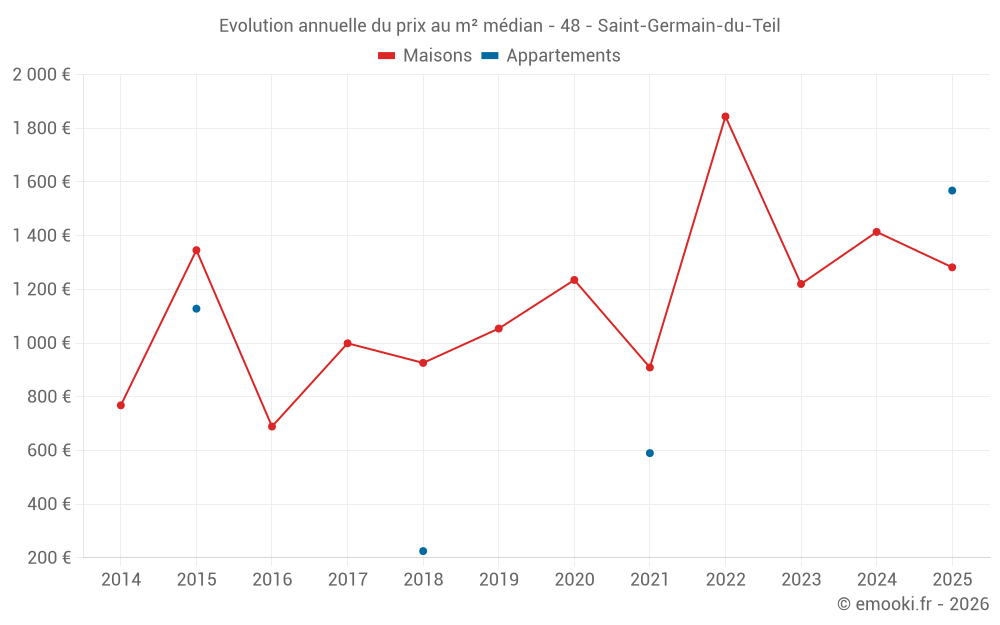 Le prix médian sur les 16 transactions de maisons des 24 derniers mois dans la commune de Saint-Germain-du-Teil était de 1 242 € par mètre carré pour une valeur foncière médiane de 121 013 €. Sur cette période 60% des transactions se sont situées entre 530 et 1 574 € par mètre carré (du 2ème au 8ème déciles).