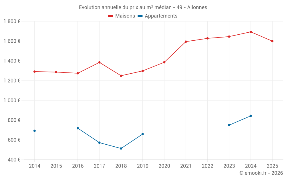 Le prix médian sur les 20 transactions de maisons des 12 derniers mois dans la commune d'Allonnes était de 1 606 € par mètre carré pour une valeur foncière médiane de 142 500 €. Sur cette période 60% des transactions se sont situées entre 1 197 et 1 841 € par mètre carré (du 2ème au 8ème déciles).