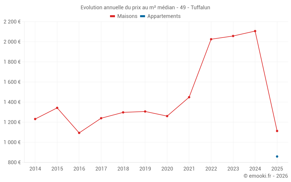 Le prix médian sur les 36 transactions de maisons des 24 derniers mois dans la commune de Tuffalun était de 2 044 € par mètre carré pour une valeur foncière médiane de 214 500 €. Sur cette période 60% des transactions se sont situées entre 1 113 et 2 479 € par mètre carré (du 2ème au 8ème déciles).