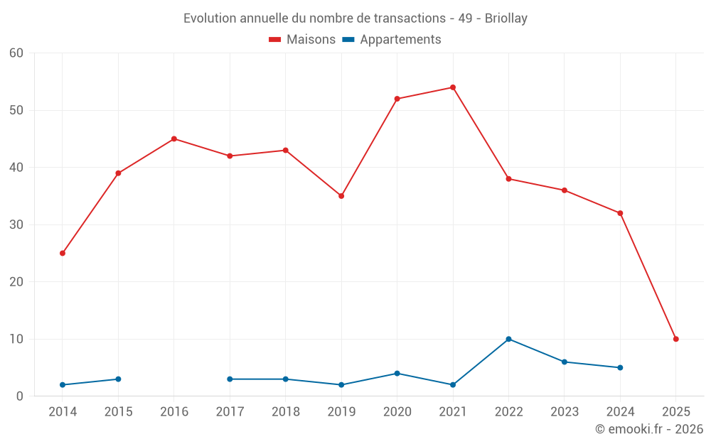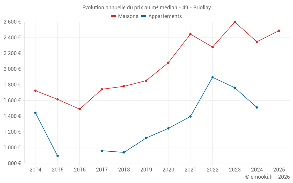 Le prix médian sur les 32 transactions de maisons des 12 derniers mois dans la commune de Briollay était de 2 483 € par mètre carré pour une valeur foncière médiane de 261 250 €. Sur cette période 60% des transactions se sont situées entre 1 782 et 2 837 € par mètre carré (du 2ème au 8ème déciles).
