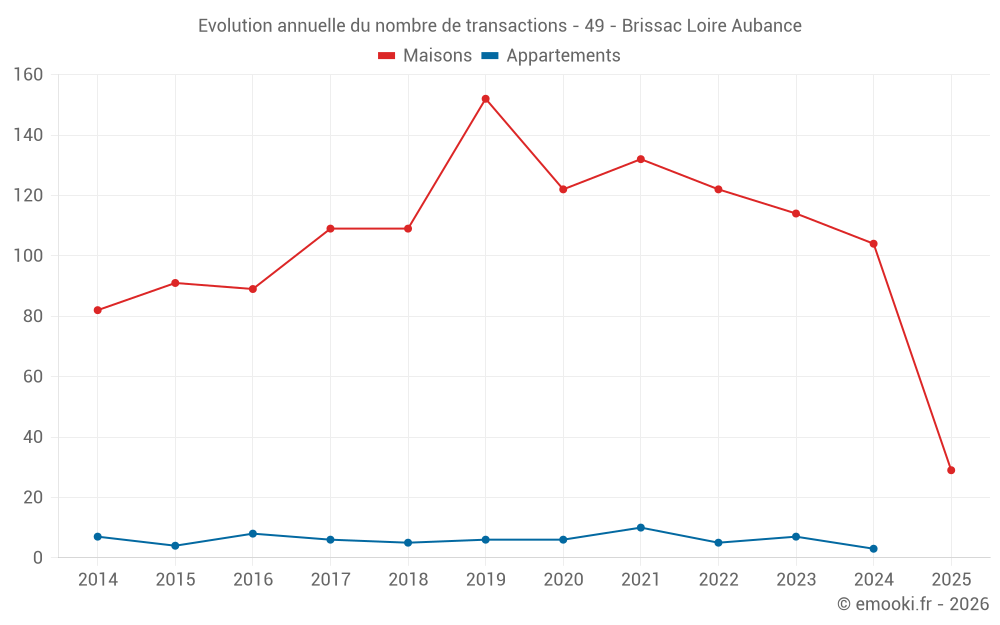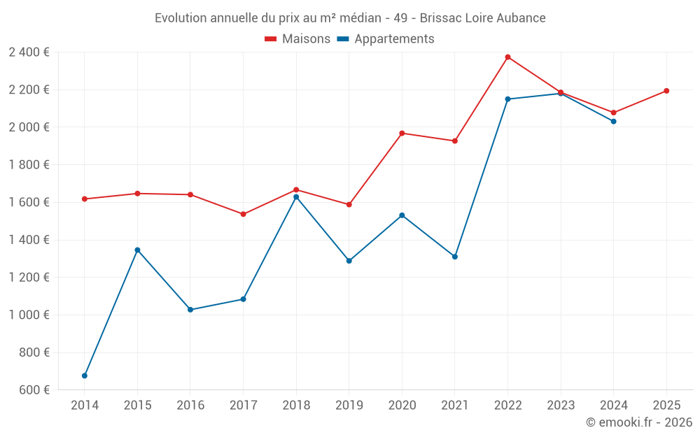 Le prix médian sur les 29 transactions de maisons des 6 derniers mois dans la commune de Brissac Loire Aubance était de 2 194 € par mètre carré pour une valeur foncière médiane de 250 000 €. Sur cette période 60% des transactions se sont situées entre 1 696 et 2 724 € par mètre carré (du 2ème au 8ème déciles).