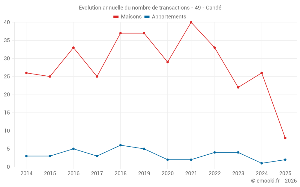 Le prix médian sur les 22 transactions de maisons des 12 derniers mois dans la commune de Candé était de 1 700 € par mètre carré pour une valeur foncière médiane de 156 250 €. Sur cette période 60% des transactions se sont situées entre 1 158 et 1 994 € par mètre carré (du 2ème au 8ème déciles).