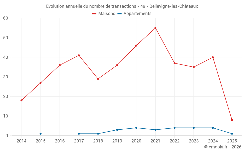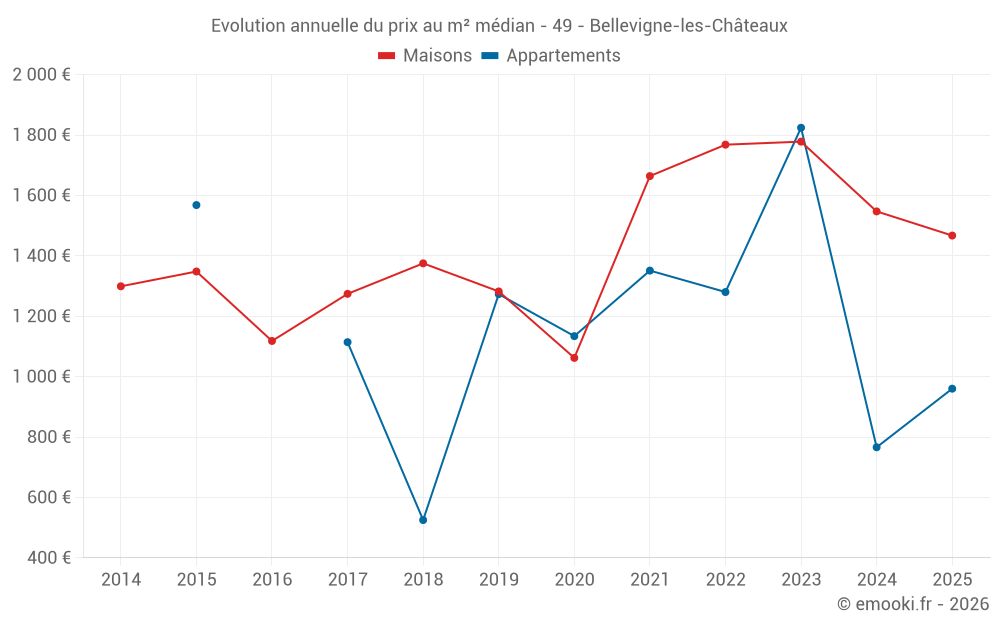 Le prix médian sur les 30 transactions de maisons des 12 derniers mois dans la commune de Bellevigne-les-Châteaux était de 1 494 € par mètre carré pour une valeur foncière médiane de 142 500 €. Sur cette période 60% des transactions se sont situées entre 1 019 et 1 884 € par mètre carré (du 2ème au 8ème déciles).
