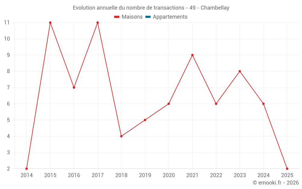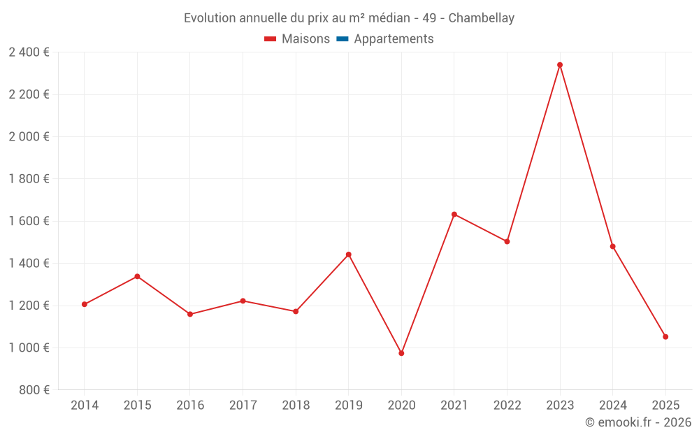 Le prix médian sur les 14 transactions de maisons des 24 derniers mois dans la commune de Chambellay était de 1 676 € par mètre carré pour une valeur foncière médiane de 197 500 €. Sur cette période 60% des transactions se sont situées entre 890 et 2 360 € par mètre carré (du 2ème au 8ème déciles).