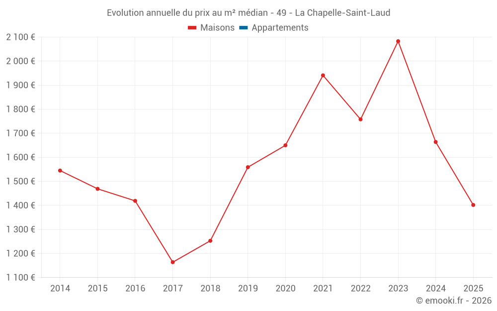 Le prix médian sur les 17 transactions de maisons des 24 derniers mois dans la commune de la Chapelle-Saint-Laud était de 1 760 € par mètre carré pour une valeur foncière médiane de 176 000 €. Sur cette période 60% des transactions se sont situées entre 1 353 et 2 403 € par mètre carré (du 2ème au 8ème déciles).