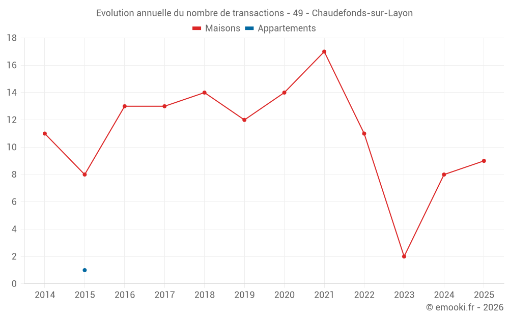 Le prix médian sur les 17 transactions de maisons des 24 derniers mois dans la commune de Chaudefonds-sur-Layon était de 2 076 € par mètre carré pour une valeur foncière médiane de 158 000 €. Sur cette période 60% des transactions se sont situées entre 1 249 et 2 335 € par mètre carré (du 2ème au 8ème déciles).