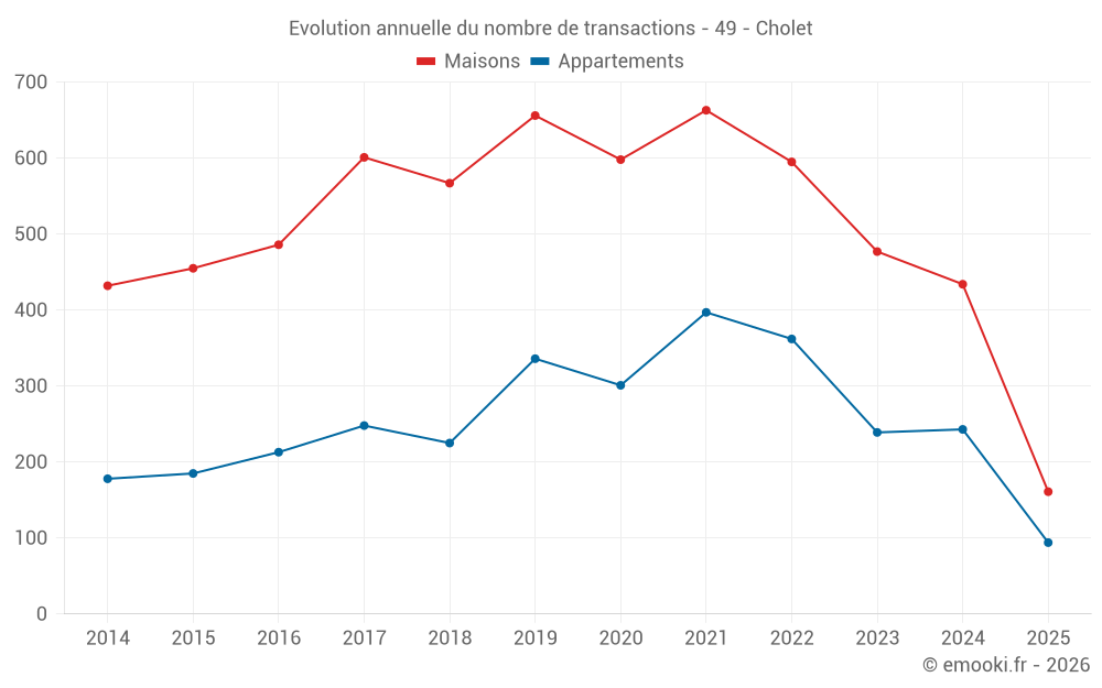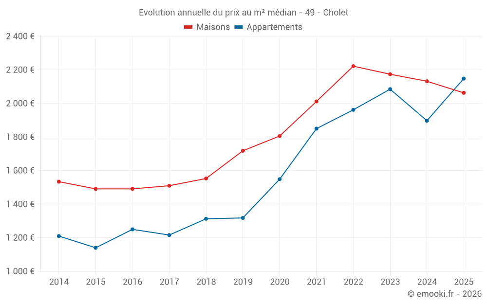 Le prix médian sur les 55 transactions de maisons des 3 derniers mois dans la commune de Cholet était de 2 062 € par mètre carré pour une valeur foncière médiane de 170 000 €. Sur cette période 60% des transactions se sont situées entre 1 621 et 2 551 € par mètre carré (du 2ème au 8ème déciles).