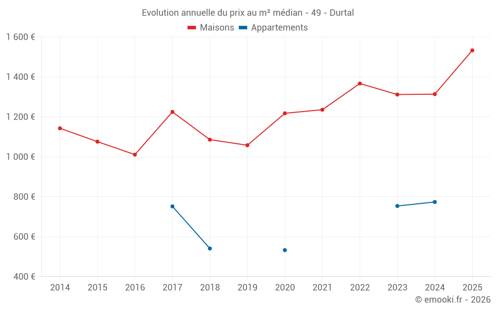 Le prix médian sur les 33 transactions de maisons des 12 derniers mois dans la commune de Durtal était de 1 435 € par mètre carré pour une valeur foncière médiane de 138 000 €. Sur cette période 60% des transactions se sont situées entre 1 044 et 1 733 € par mètre carré (du 2ème au 8ème déciles).