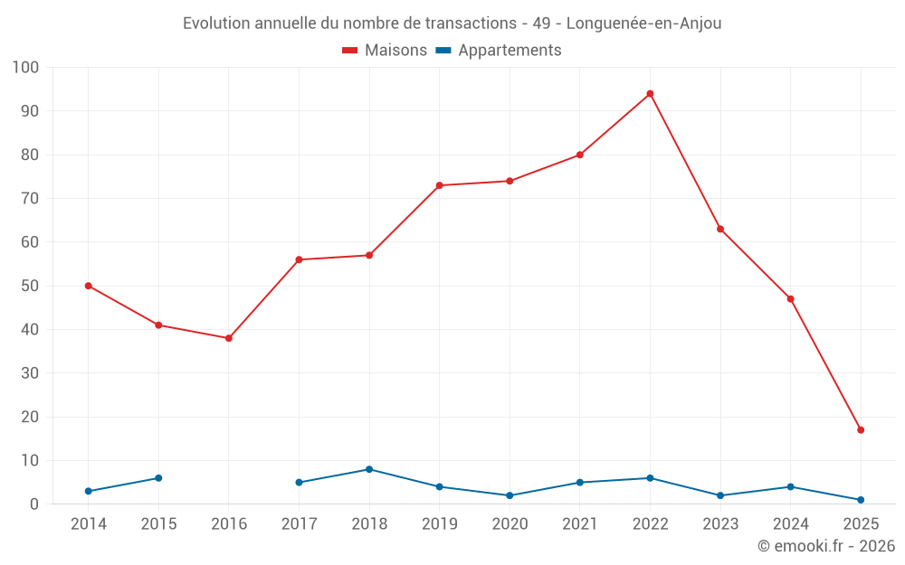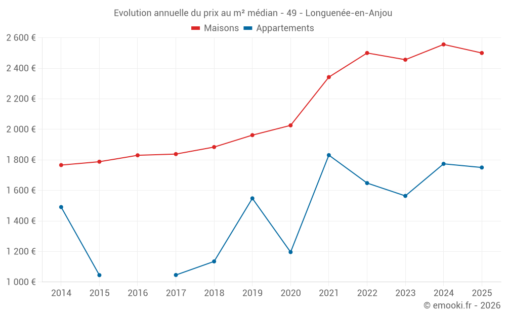 Le prix médian sur les 49 transactions de maisons des 12 derniers mois dans la commune de Longuenée-en-Anjou était de 2 574 € par mètre carré pour une valeur foncière médiane de 258 200 €. Sur cette période 60% des transactions se sont situées entre 2 117 et 3 100 € par mètre carré (du 2ème au 8ème déciles).