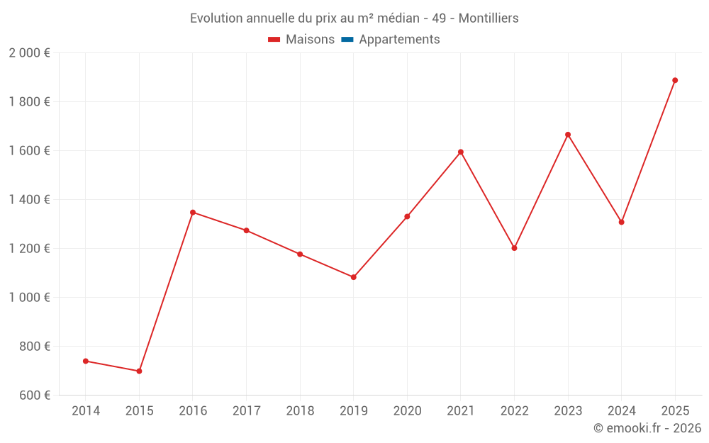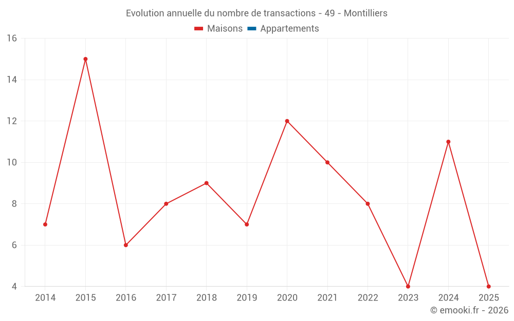 Le prix médian sur les 18 transactions de maisons des 24 derniers mois dans la commune de Montilliers était de 1 432 € par mètre carré pour une valeur foncière médiane de 155 000 €. Sur cette période 60% des transactions se sont situées entre 877 et 1 960 € par mètre carré (du 2ème au 8ème déciles).