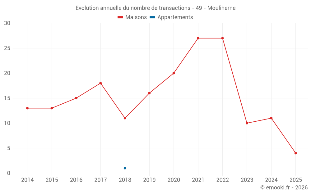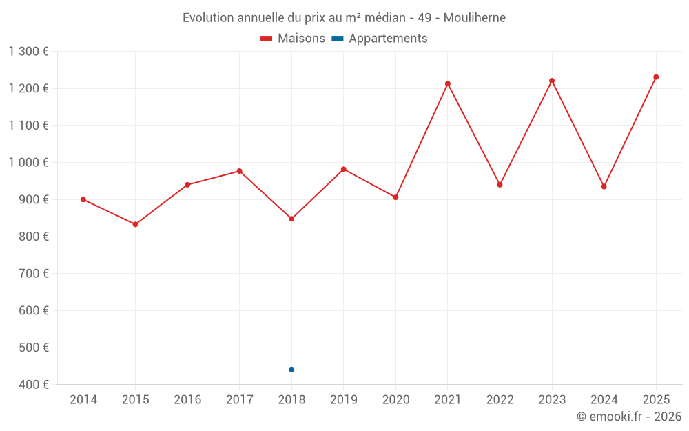 Le prix médian sur les 21 transactions de maisons des 24 derniers mois dans la commune de Mouliherne était de 1 035 € par mètre carré pour une valeur foncière médiane de 93 000 €. Sur cette période 60% des transactions se sont situées entre 800 et 1 427 € par mètre carré (du 2ème au 8ème déciles).