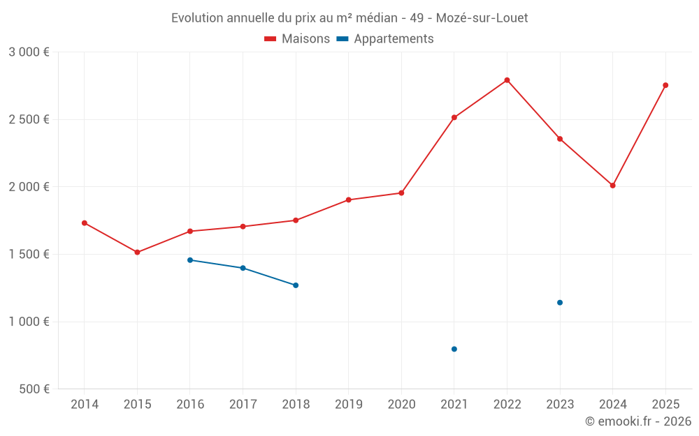 Le prix médian sur les 24 transactions de maisons des 24 derniers mois dans la commune de Mozé-sur-Louet était de 2 297 € par mètre carré pour une valeur foncière médiane de 277 500 €. Sur cette période 60% des transactions se sont situées entre 1 719 et 2 785 € par mètre carré (du 2ème au 8ème déciles).