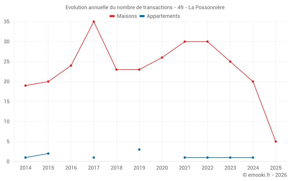 Le prix médian sur les 36 transactions de maisons des 24 derniers mois dans la commune de la Possonnière était de 2 240 € par mètre carré pour une valeur foncière médiane de 257 500 €. Sur cette période 60% des transactions se sont situées entre 1 864 et 3 086 € par mètre carré (du 2ème au 8ème déciles).