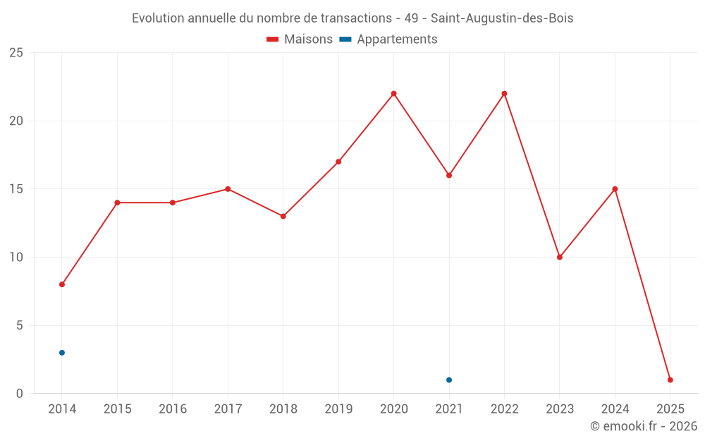 Le prix médian sur les 21 transactions de maisons des 24 derniers mois dans la commune de Saint-Augustin-des-Bois était de 2 167 € par mètre carré pour une valeur foncière médiane de 195 000 €. Sur cette période 60% des transactions se sont situées entre 1 557 et 2 400 € par mètre carré (du 2ème au 8ème déciles).