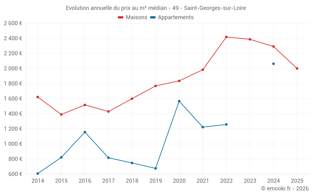 Le prix médian sur les 17 transactions de maisons des 12 derniers mois dans la commune de Saint-Georges-sur-Loire était de 2 296 € par mètre carré pour une valeur foncière médiane de 242 200 €. Sur cette période 60% des transactions se sont situées entre 1 894 et 2 789 € par mètre carré (du 2ème au 8ème déciles).