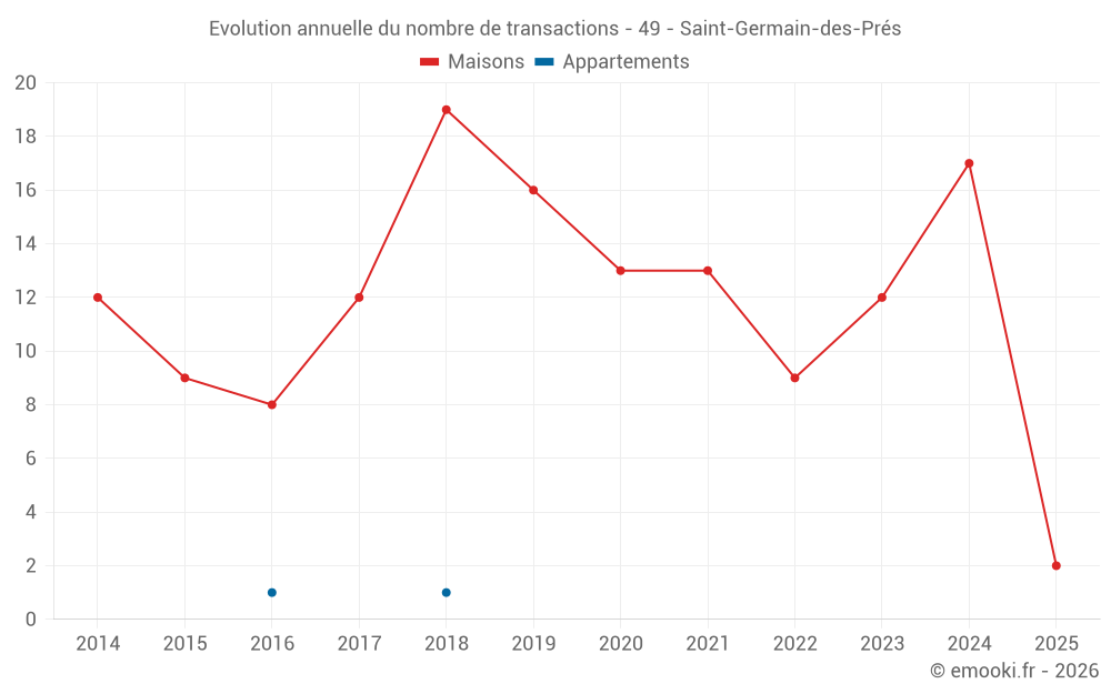 Le prix médian sur les 26 transactions de maisons des 24 derniers mois dans la commune de Saint-Germain-des-Prés était de 2 050 € par mètre carré pour une valeur foncière médiane de 220 900 €. Sur cette période 60% des transactions se sont situées entre 1 578 et 2 553 € par mètre carré (du 2ème au 8ème déciles).
