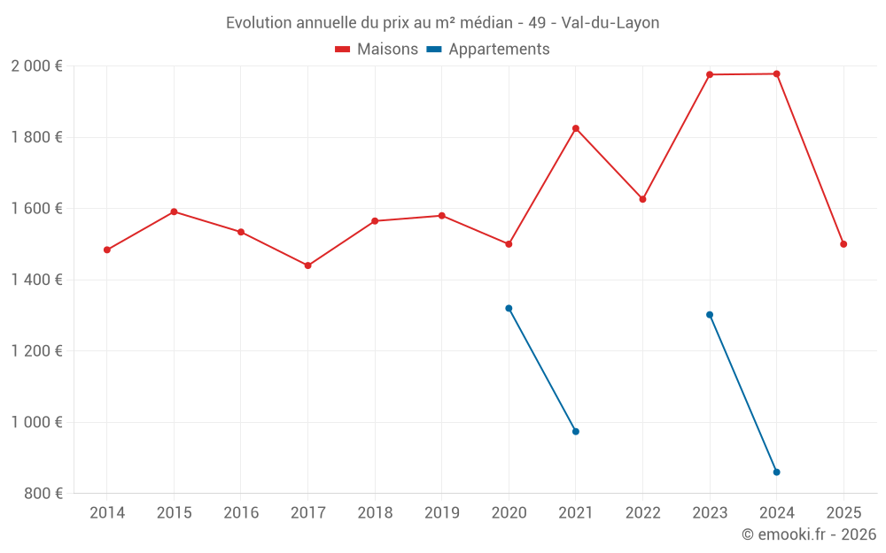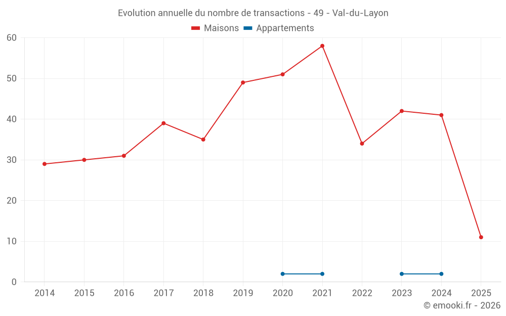 Le prix médian sur les 39 transactions de maisons des 12 derniers mois dans la commune de Val-du-Layon était de 1 862 € par mètre carré pour une valeur foncière médiane de 180 000 €. Sur cette période 60% des transactions se sont situées entre 1 254 et 2 477 € par mètre carré (du 2ème au 8ème déciles).