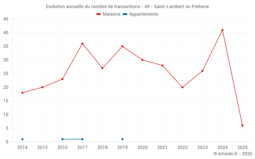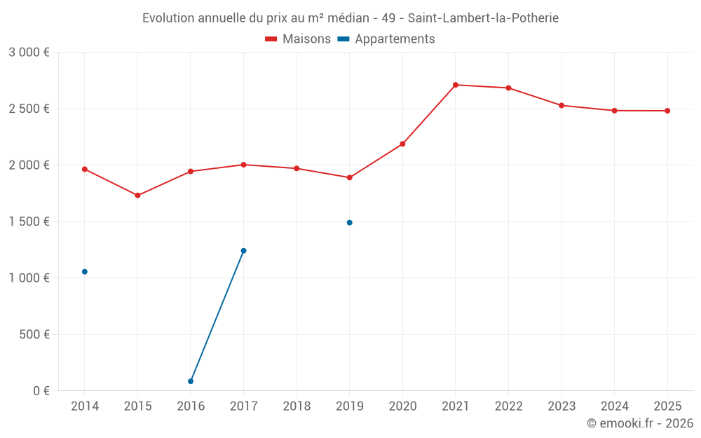 Le prix médian sur les 21 transactions de maisons des 12 derniers mois dans la commune de Saint-Lambert-la-Potherie était de 2 307 € par mètre carré pour une valeur foncière médiane de 254 800 €. Sur cette période 60% des transactions se sont situées entre 1 869 et 2 824 € par mètre carré (du 2ème au 8ème déciles).