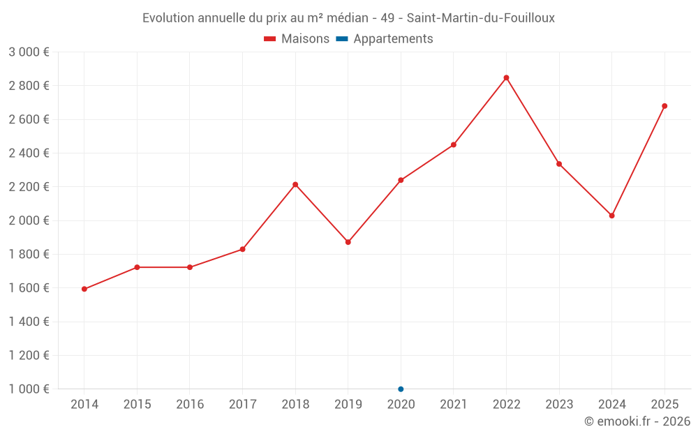 Le prix médian sur les 26 transactions de maisons des 24 derniers mois dans la commune de Saint-Martin-du-Fouilloux était de 2 272 € par mètre carré pour une valeur foncière médiane de 247 500 €. Sur cette période 60% des transactions se sont situées entre 1 639 et 2 922 € par mètre carré (du 2ème au 8ème déciles).